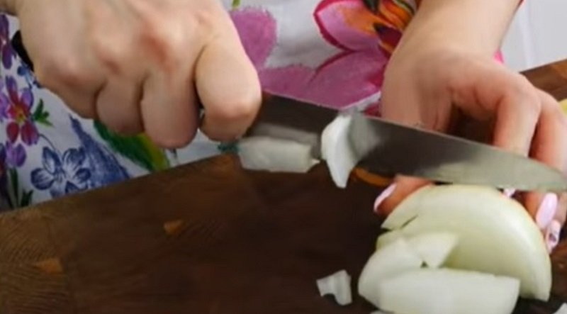 - Лук очисти и нарежь крупными кубиками. Переложи лук на хорошо разогретую сковороду с растительным маслом и обжарь до золотистости.