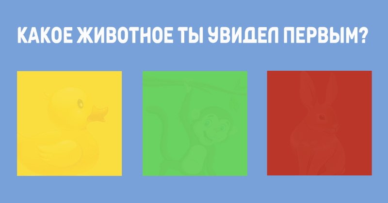 Просто посмотри на расположенную выше картинку, которая вмещает в себе три цветных квадрата. В каждом квадрате скрыто изображение животного. Отметь, какого «зверя» первым делом тебе удалось разглядеть.