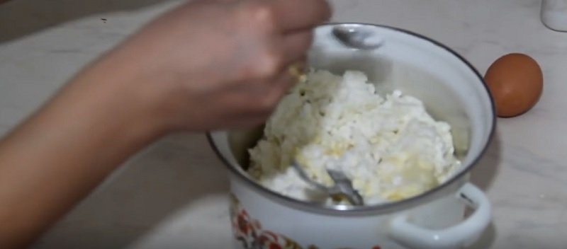 - Разомни творог, чтобы не было комков и чтобы он хорошо перемешался с содой.