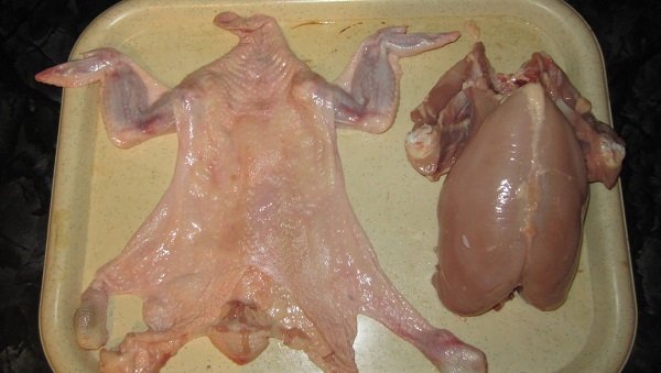 - Курочку вымой, с осторожностью сними кожу с нее так, чтобы в коже остались кончики ножек и крылышки.
