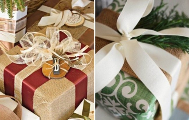 Мешковина — универсальный материал. Оберни ею подарок и обвяжи его атласной лентой. - Елочная игрушка