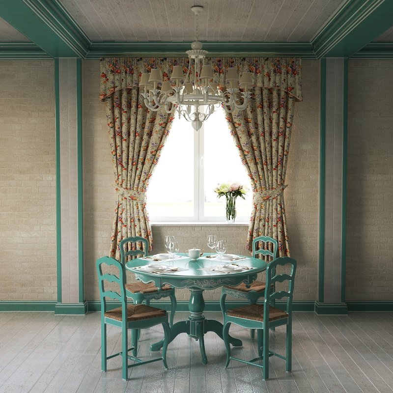 - Кухня будет выглядеть очень стильной, если принт на шторах будет перекликаться со скатертью и другими предметами декора.