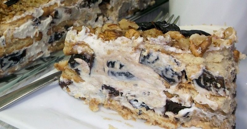 © Depositphotos - Повтори процедуру несколько раз, пока не закончатся ингредиенты: печенье, смоченное молоком, крем, орехи, чернослив, крем. Теперь накрывай торт пищевой пленкой и ставь его в холодильник на несколько часов.