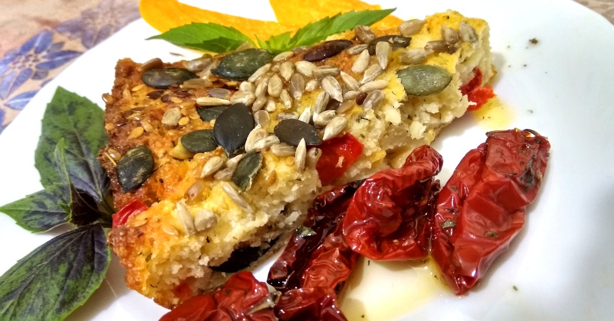 - Посыпь запеканку зеленью и семечками. Выпекай 30–40 минут в духовке разогретой до 200 градусов. Чтобы семечки не пригорели, спустя 15 минут выпекания накрой форму куском пергамента или фольги.