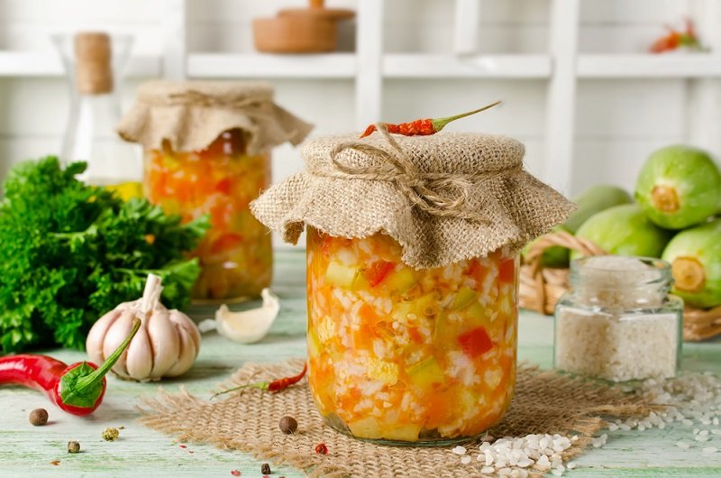Это довольно простой салат с рисом на зиму, который может служить и гарниром. Без редких для нашей местности или дорогих продуктов, только рисовая крупа и сезонные овощи из огорода или с рынка.