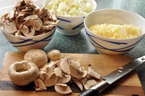 - Нарежь грибы тонкой соломкой, лук — небольшими кубиками, а сыр натри на терке.