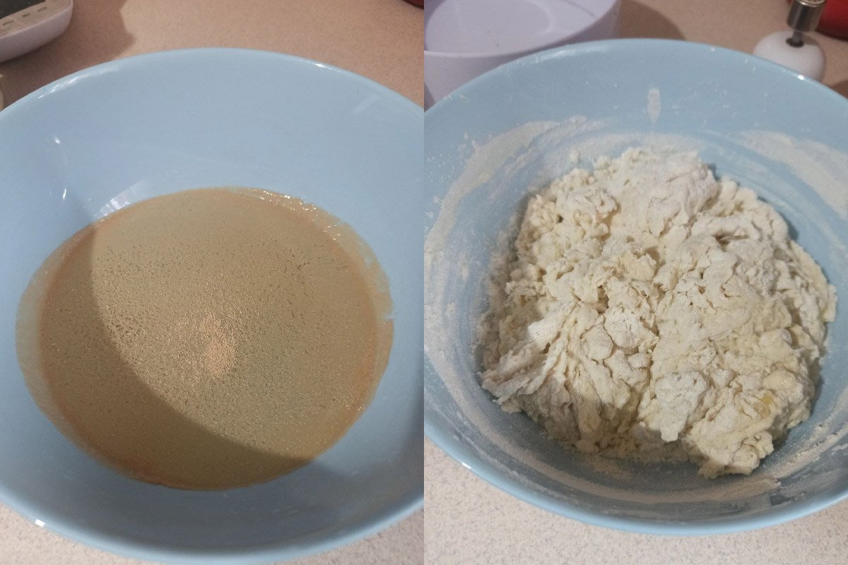 - Первым делом тебе нужно слегка нагреть воду. Идеально, чтобы она была не ниже и не выше 38 градусов. Тогда дрожжи заработают так, как нужно. В воду добавь сахар, соль, дрожжи и растительное масло. У меня оливковое. Хорошенько всё перемешай, чтобы ингредиенты растворились.