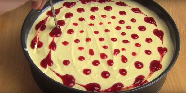 - 3/4 малинового джема размажь поверх крема, а затем выложи вторую часть сырной массы.