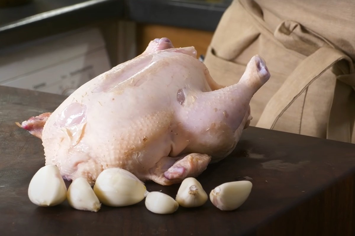 - В этом рецепте целых три фирменных секрета Высоцкого. И первый из них — комочек пряностей, которым нужно натирать цыпленка. Для того чтобы его приготовить, натри чеснок на терке и разотри с солью и перцем, после чего сформируй влажный комочек. Перец лучше брать свежемолотый, так получится ароматнее. А соль рассчитывай из соотношения 10 г на 1 кг мяса. Если цыпленок крупный, будет лучше взять 15 г соли.