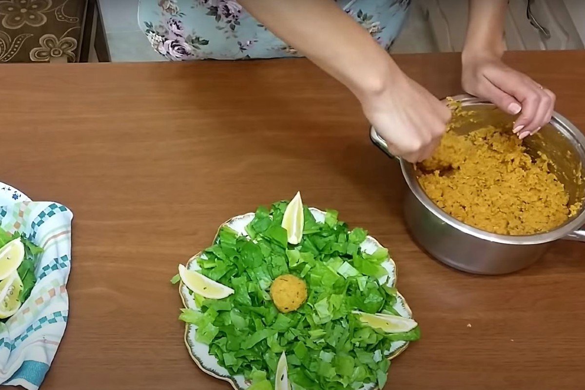 - Крупно нарежь салат и выложи его на тарелку. Туда же положи дольки лимона. Из чечевичной смеси вылепи шарики и аккуратно разложи их среди зелени и лимонных долек.