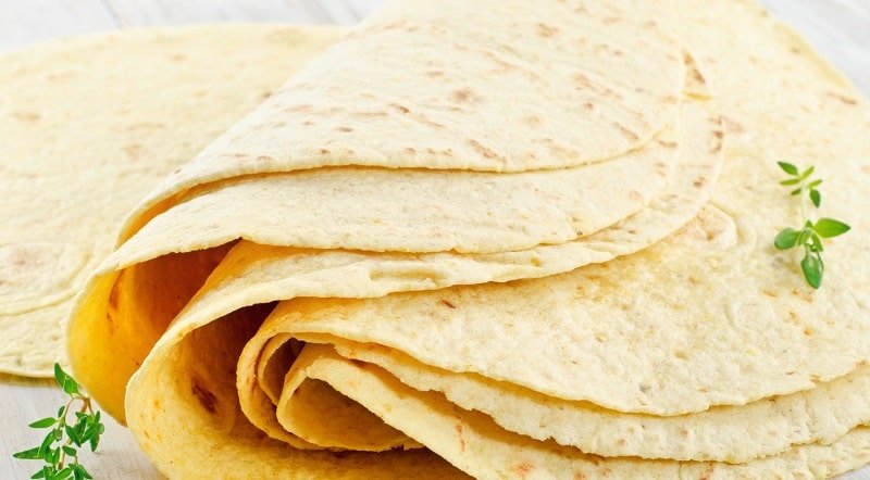 - При помощи лопатки сверни тартилью с двух сторон в виде конвертика, а затем переверни, чтоб сгибы касались дна сковороды. Обжаривай еще минуту-две.