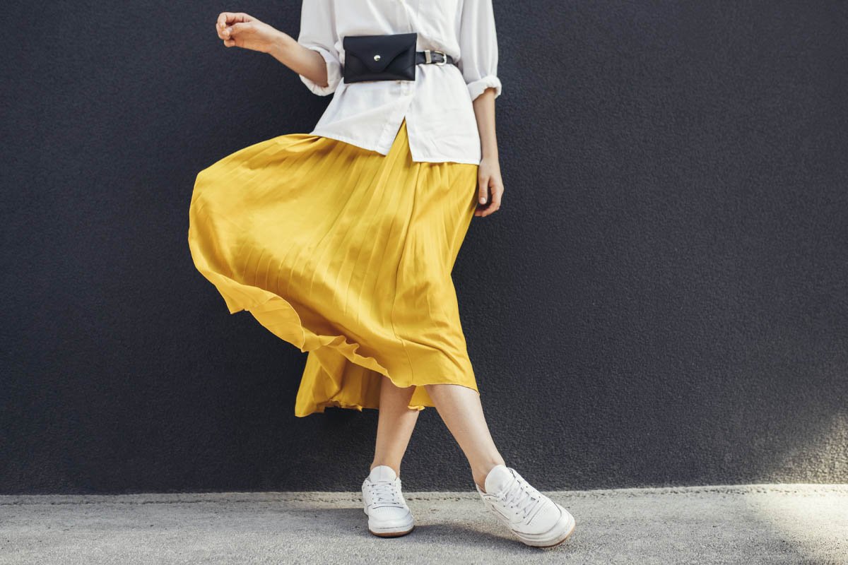 В стремлении за комфортом девушки миксуют в одном образе разные стили. Часто это получается классно, но некоторые луки причиняют боль стилистам. Например, сочетание длинной и пышной юбки с кроссовками. Такой образ устарел. Лучше уж взять юбку покороче, тогда кроссовки будут выглядеть органично.