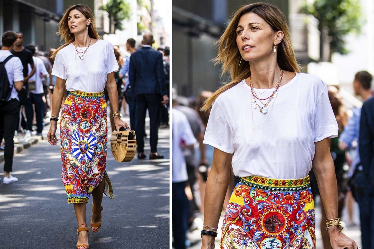 С помощь длинной юбки можно создать сдержанный и элегантный образ. Но если нужно что-то неформальное, можно добавить футболку и заправить ее в юбку. Такой образ будет выглядеть стильно и отлично подчеркнет талию.