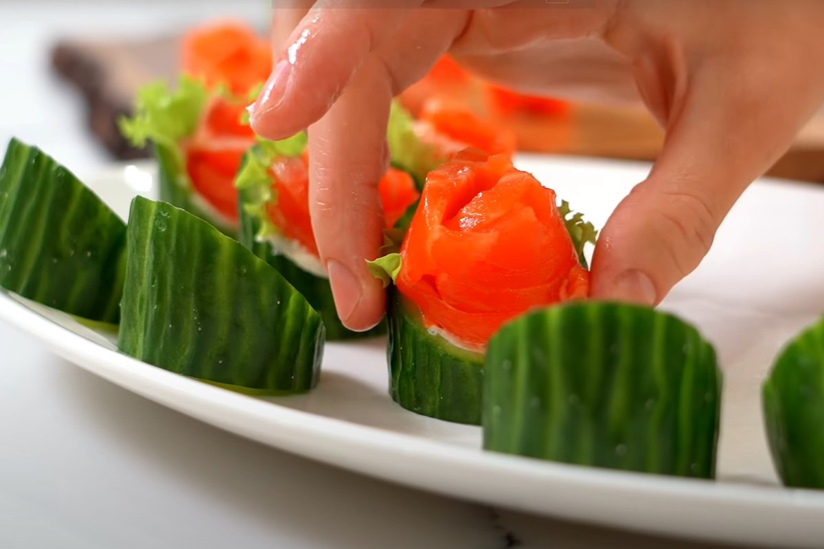 Идею с оформлением тоже подсмотрела на кулинарном канале. Рыбу нужно нарезать тонкими ленточками и скрутить в розочку. Затем поставь ее в огуречную тарталетку на подложку из сыра с кусочком салатного листа. Получается лучше чем суши и роллы!