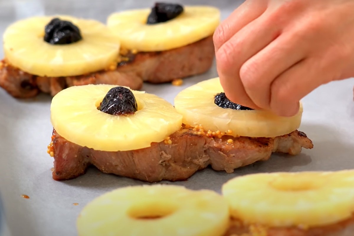 Итак, на каждый стейк положи по два кольца ананаса, а внутрь колец замоченный заранее чернослив без косточки (или крупные оливки). Теперь присыпь всё натертым сыром и запекай в духовке 20 минут при 200 градусах.