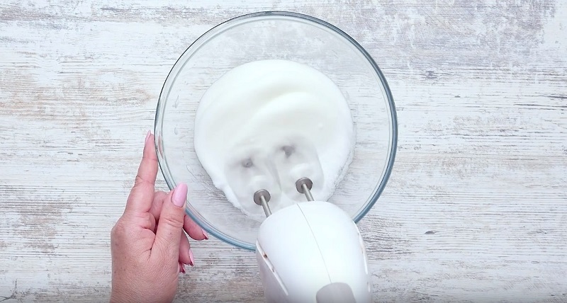 - Отдели желтки от белков. В отдельной посуде взбей белки до состояния густой пены.