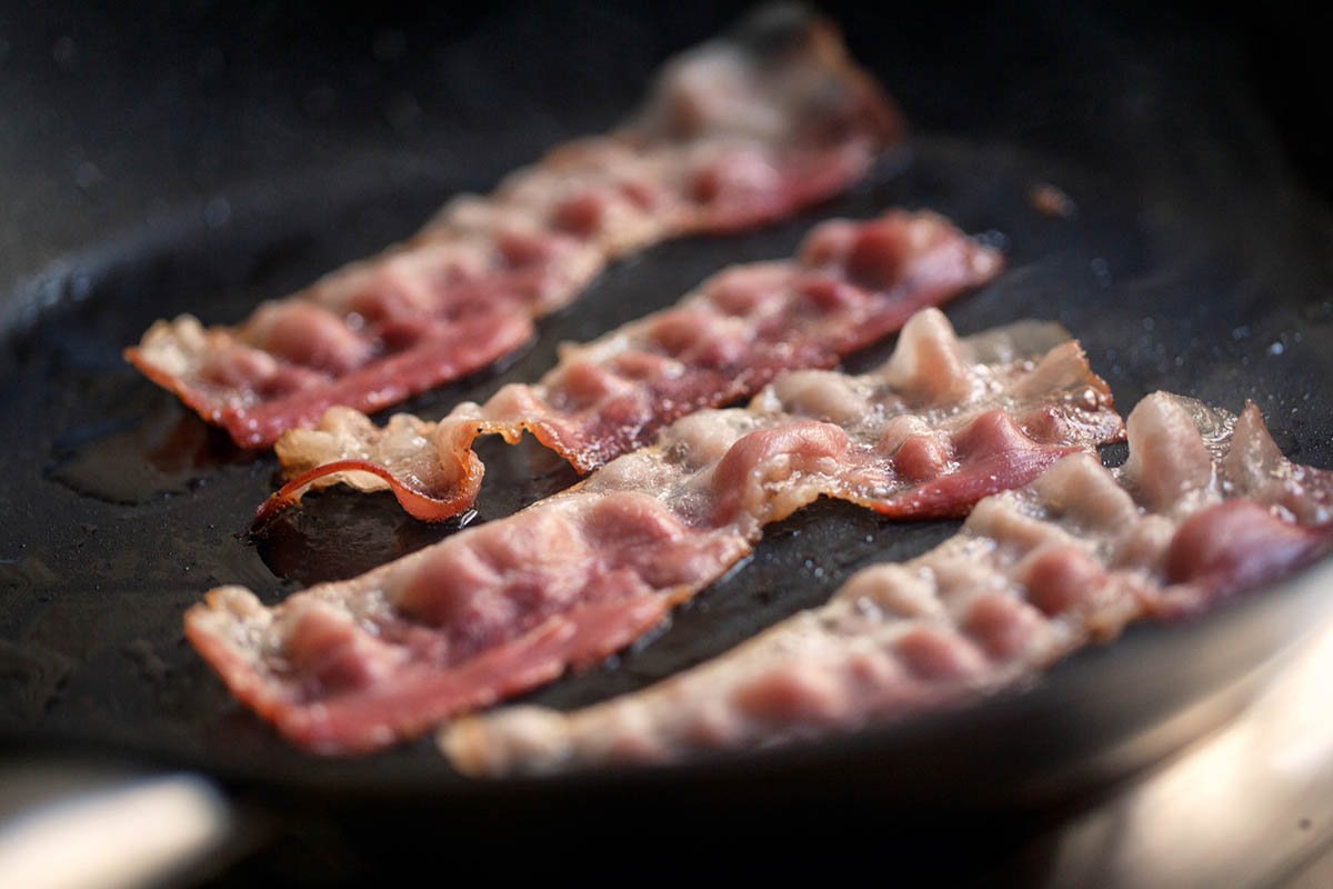 А Светлана попросила дать ей небольшой кусок бекона. Она порезала свинину и стала обжаривать. Потом добавила к бекону две измельченные луковицы. Когда лук хорошо прожарился, наша гостья его посолила и добавила немного перца.