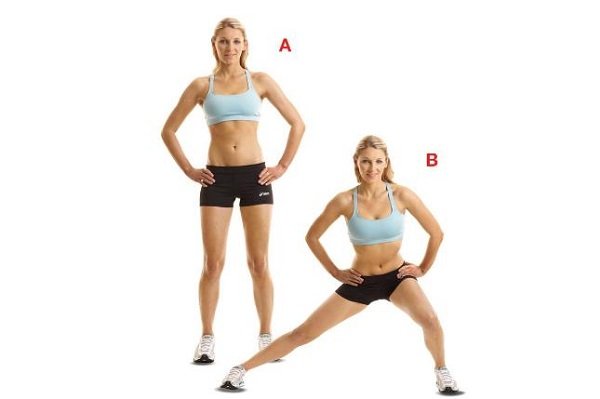 - Сделай выпад в сторону, переместив вес тела на правую ногу. Левую ногу вытяни, затем поменяй положение ног. Повтори 12 раз.